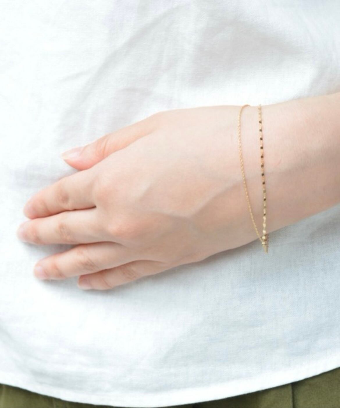 タイプの違う2本のチェーンを組み合わせたシンプルなデザインです。それぞれに揺れ動くチェーンが光を反射し、華やかに手元を飾ります。
